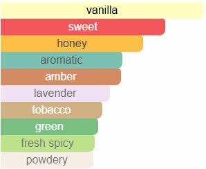 Овој интензивен мирис го разгорува огнот на сетилата на горниот дел од телото и на меката кожа и дава запалена сензуалност. По освежувачкиот нане, плимата се зголемува до зависност, станувајќи пенлив еликсир. Во овој здив на свеж воздух, лавандата брзо добива славни размери, засилени со балсамичното богатство на бензоин со акценти на сирупска ванила. Зрното тонка доминира со топлите и слатки тонови помеѓу медот и тутунот. Горни ноти – нане, лаванда Средни ноти – ванила, бензоин Основни ноти – тонка, мед, тутун